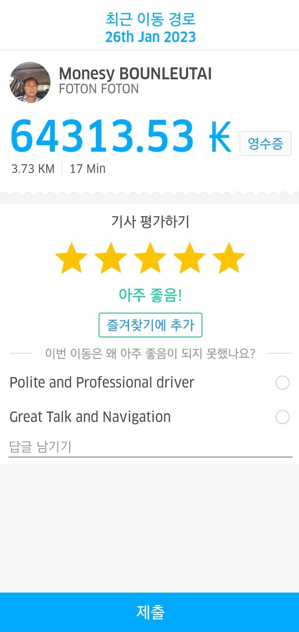 4. 도착 후 현금을 지불하고 드라이버 평가를 하면 됩니다(선택).